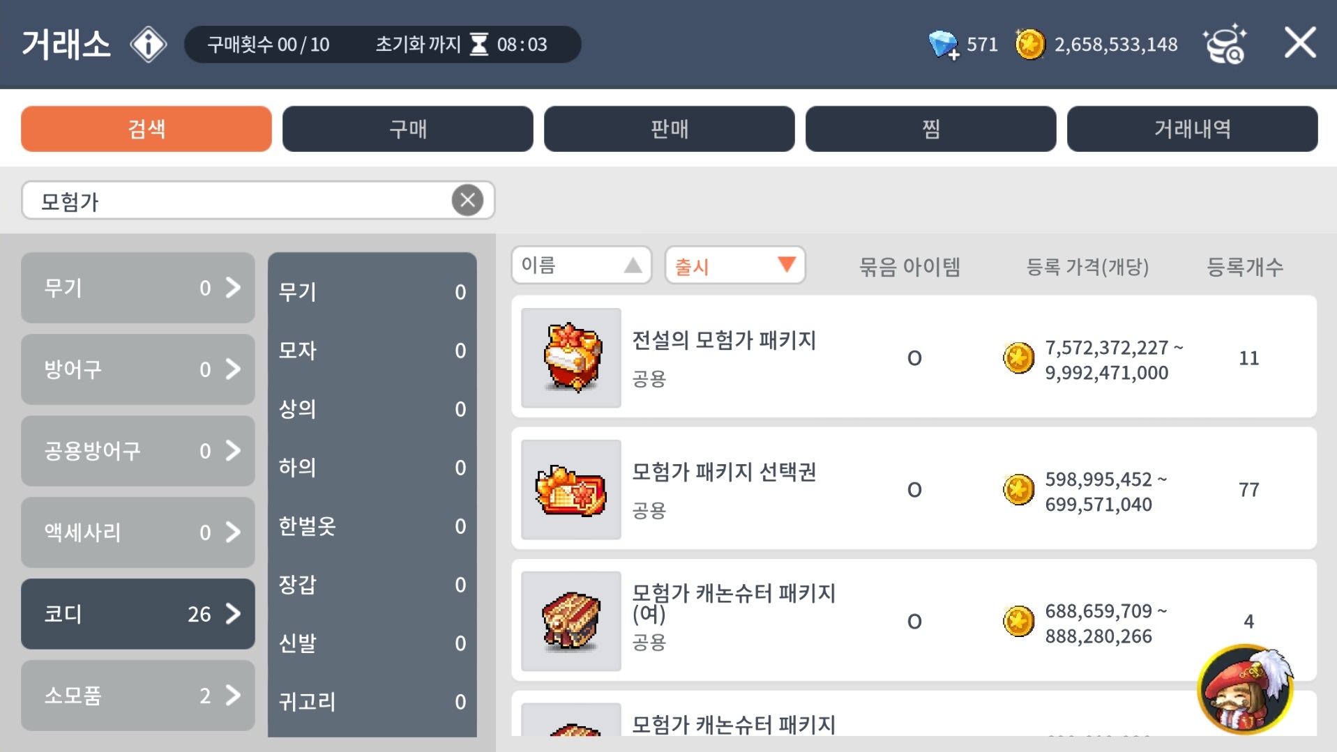모험가 코디 패키지 거래소 최저가 가격 (2024.01.23 기준)