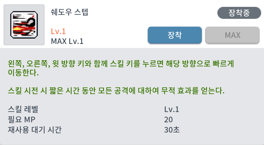 2번 : 쉐도우 스텝 (왼쪽/오른쪽/윗방향 ←↑→ 원하는 방향으로 이동 - 스우 1페이즈 줄넘기 가능) (스킬 시전시 3초동안 모든 무적기)