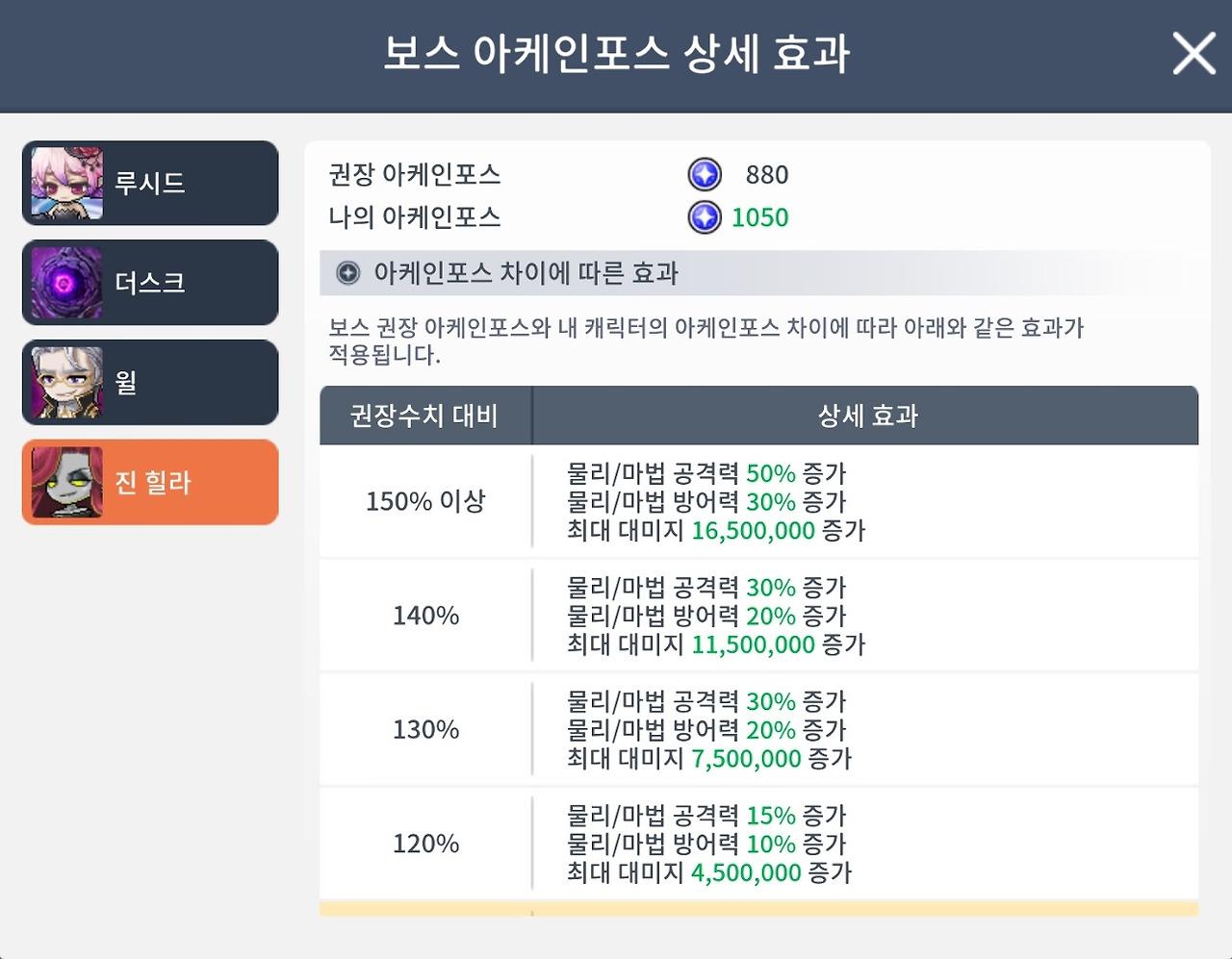 [군단장 - 진 힐라] 보스 아케인포스 상세효과 [◈아케인포스 880 이상] [880 970 1060 1150 1240 1320]