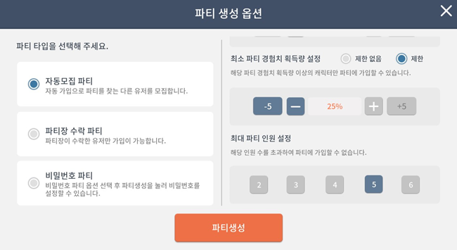 - 파티 생성 시, 현재 캐릭터의 파티 경험치 획득량(%)을 초과하여 옵션을 설정할 수 없습니다.