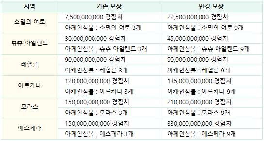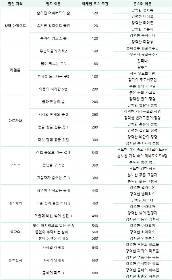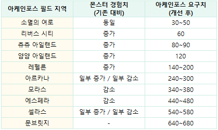 - 지역별 아케인포스 필드 몬스터 경험치/아케인포스 요구치는 다음과 같이 변경됩니다.