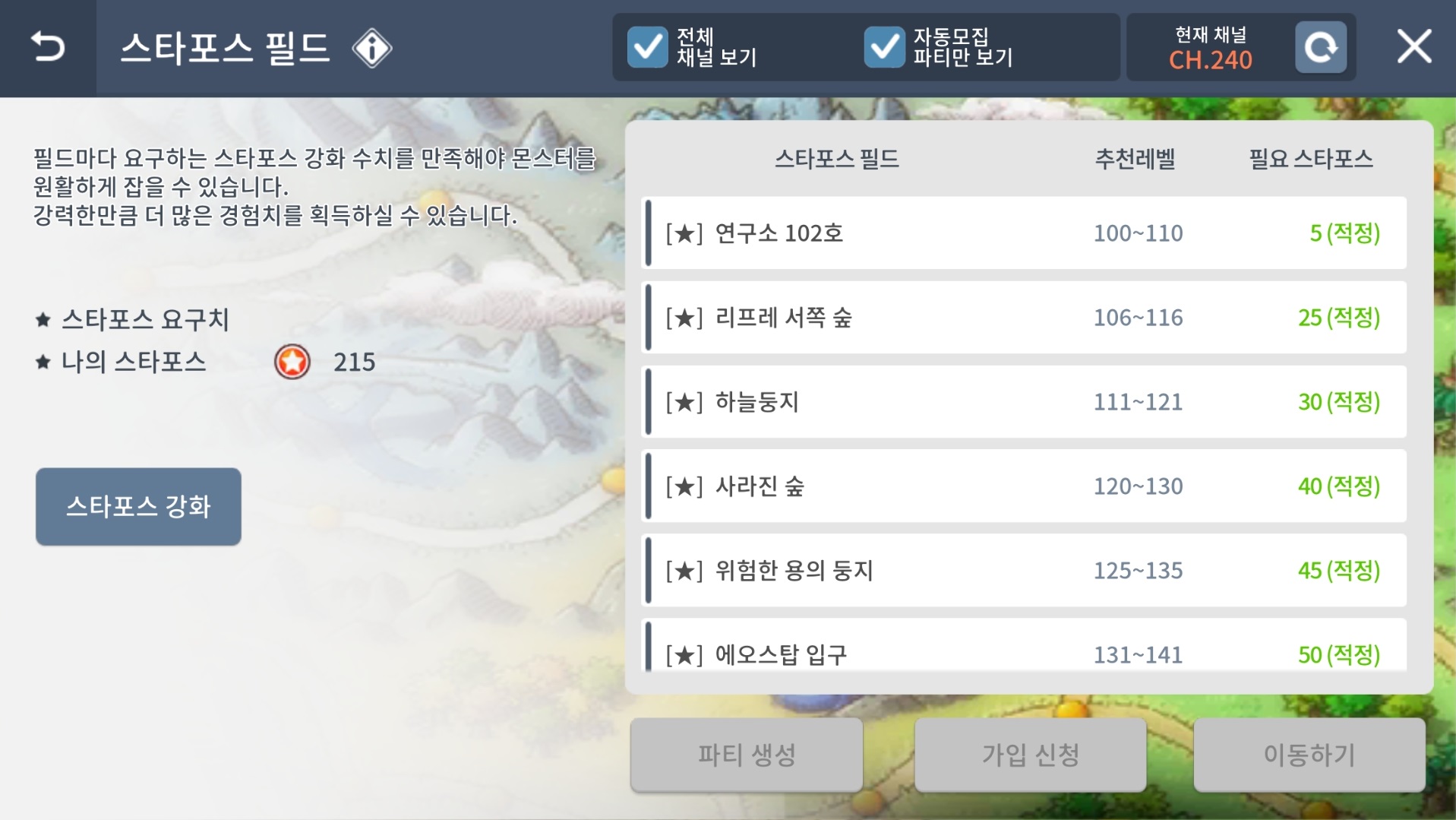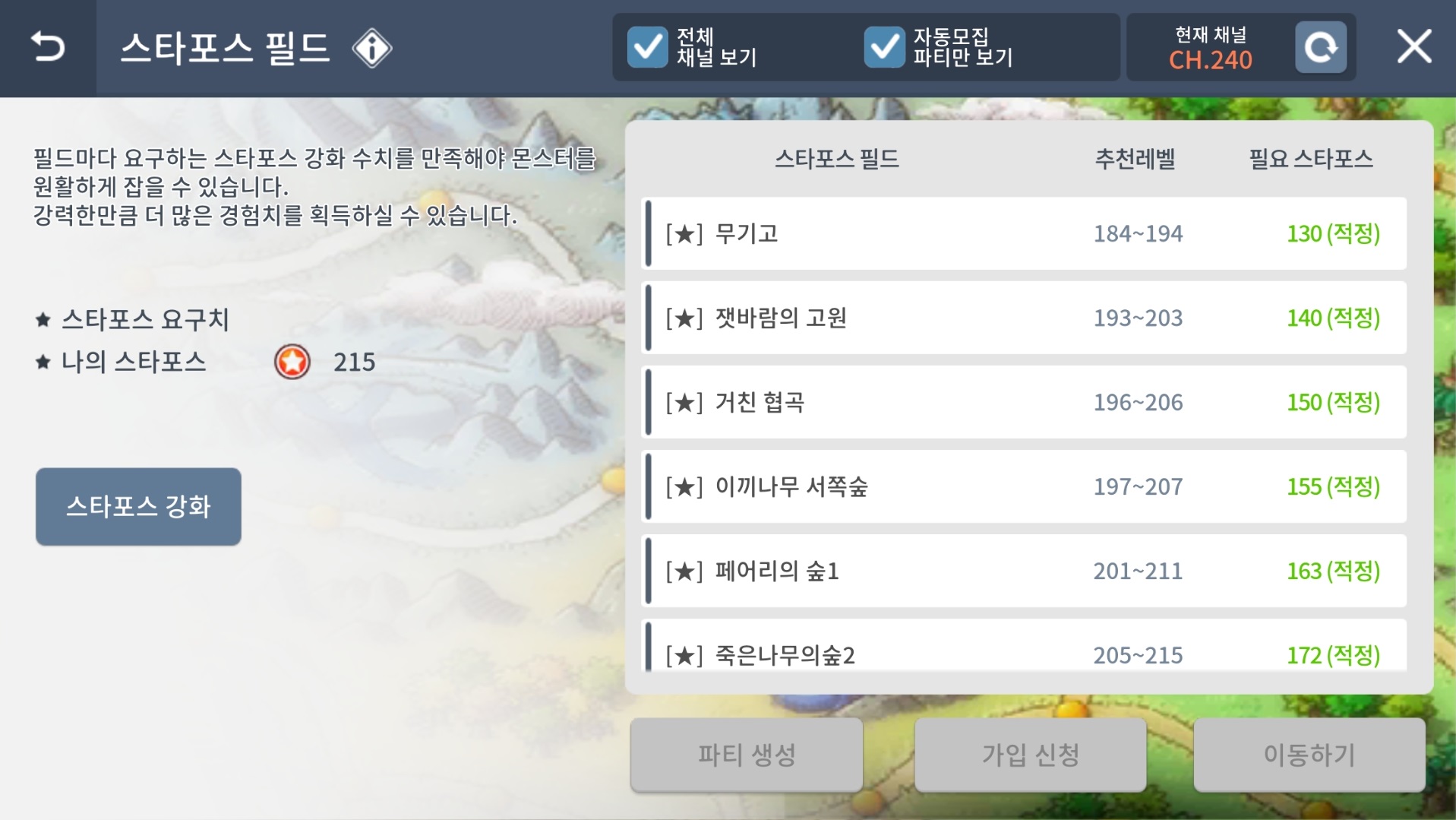 - 스타포스/아케인포스 필드는 빠른 콘텐츠를 통해 입장할 수 있습니다.