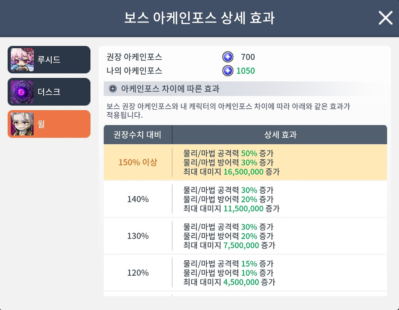 [군단장 윌] 아케인포스 상세 효과 [◈아케인포스 700 이상] [700 770 840 910 980 1050]