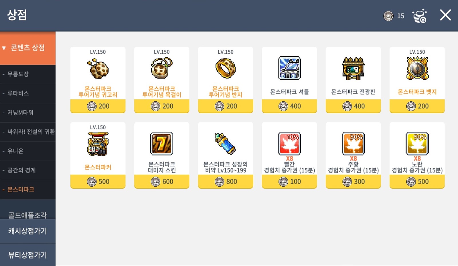 주황 경험치 증가권(15분)x8 (300코인)