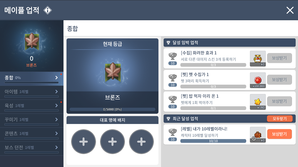 - 명예 배지는 각 업적 카테고리 우측 상단의 [레벨 달성 보상]에서 획득 가능합니다.