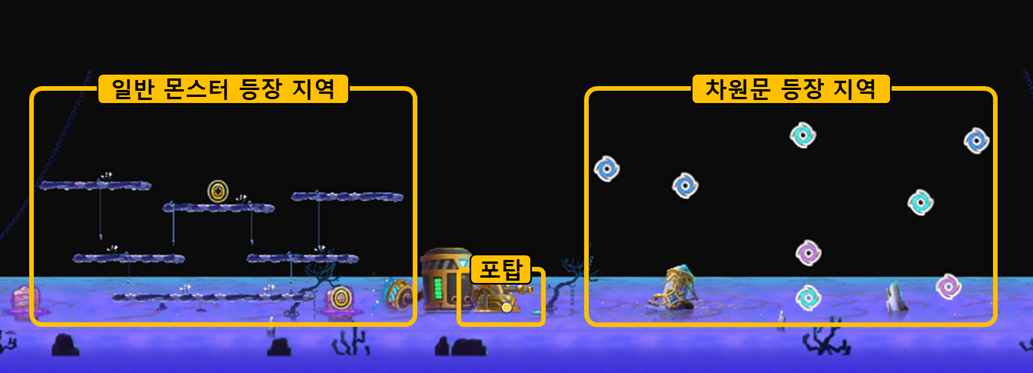 - 맵의 오른쪽 구역에는 뒤틀린 차원문이 존재하며, 캐릭터는 해당 구역에 진입할 수 없습니다.