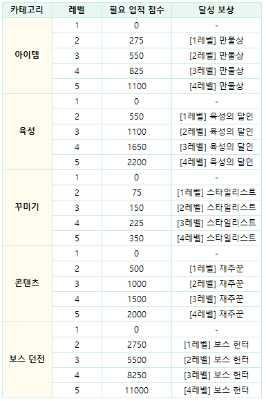 - 단, 보스 던전 업적은 이전 진행 중, 또는 완료한 횟수부터 이어서 진행됩니다.