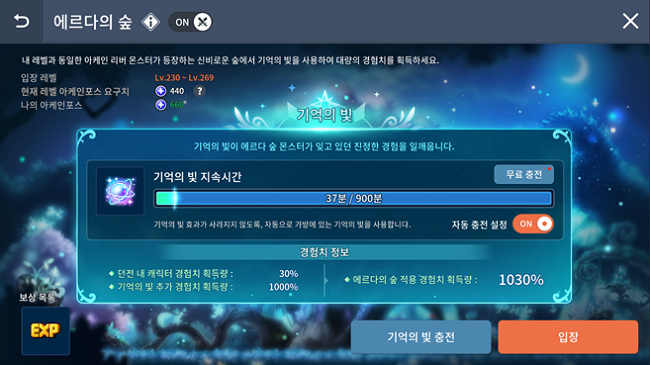 - 메인 페이지에서 에르다의 숲 던전 진입 전, 던전진입 후 적용될 경험치 정보를 확인할 수 있습니다.