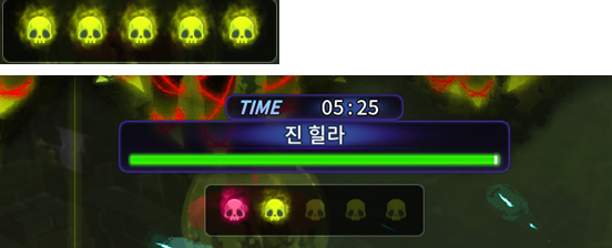 - 소환된 진 힐라의 제단에 근접했을 때, 게이지가 충전되고, 모두 충전되어 진 힐라의 제단이 파괴됐을 때 붉은 해골로 변했던 데스 카운트가 녹색 해골로 전환 됩니다.