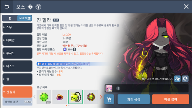- 보스 진 힐라는 주간 1회 클리어 가능하며 매주 목요일 오전 0시에 클리어 횟수가 초기화 됩니다.