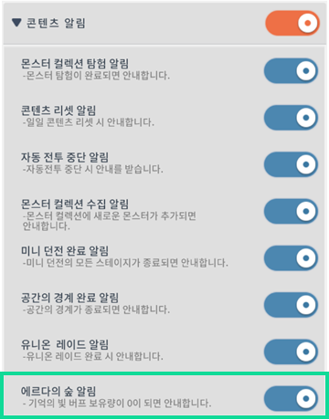 - 에르다의 숲 알림: 기억의 빛 버프 보유량이 0이되면 푸시 알림이 발송됩니다.