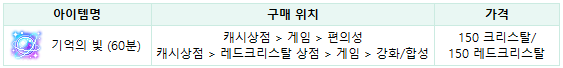 ▶ 기억의 빛 아이템 판매 정보