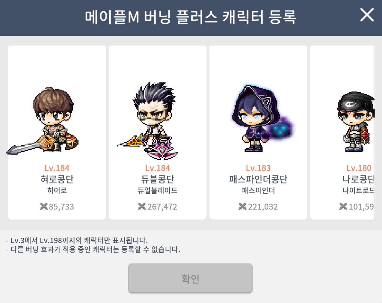 계정당 Lv.3 ~ Lv.198 사이의 캐릭터 1개를 메이플M 버닝 플러스 캐릭터로 등록할 수 있습니다.