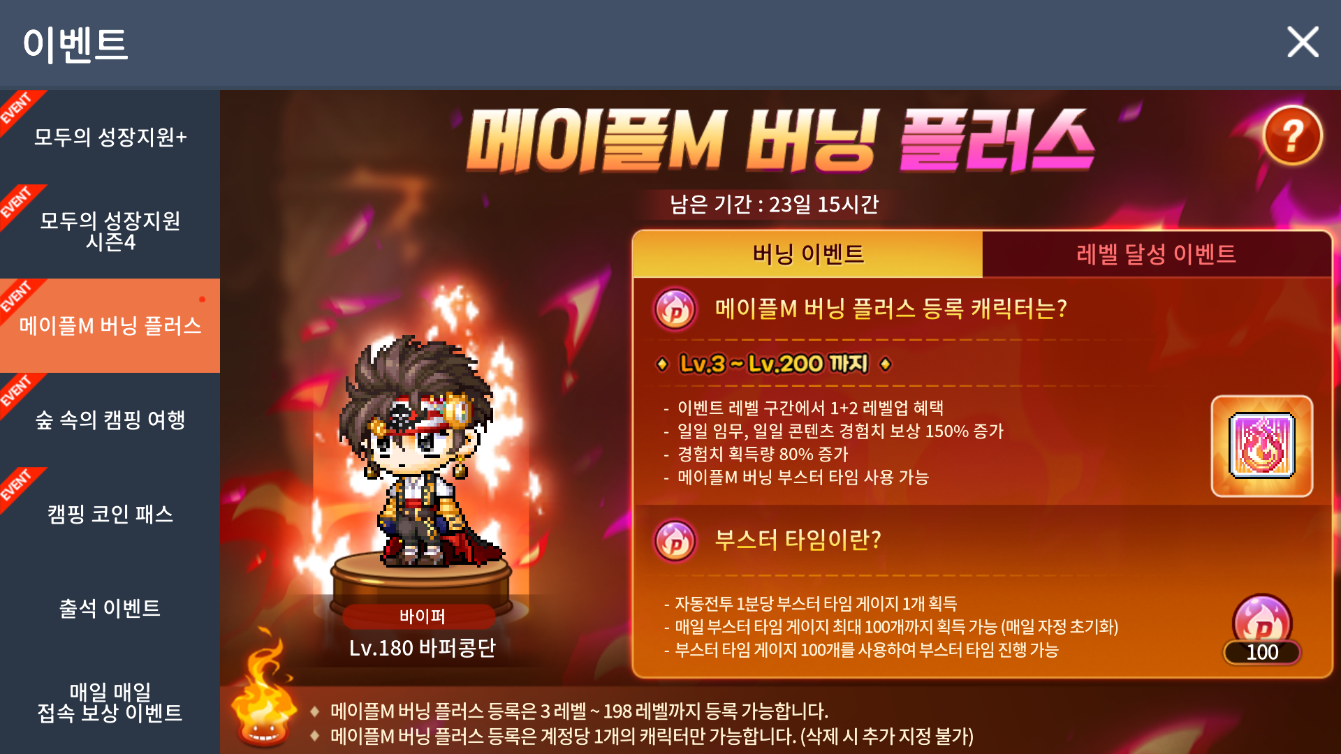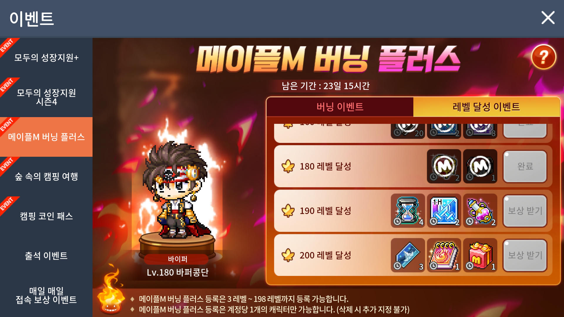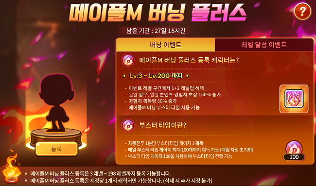 * 이벤트 기간이 종료되거나 Lv.200을 달성한 경우, 메이플M 버닝 플러스 효과가 사라집니다.