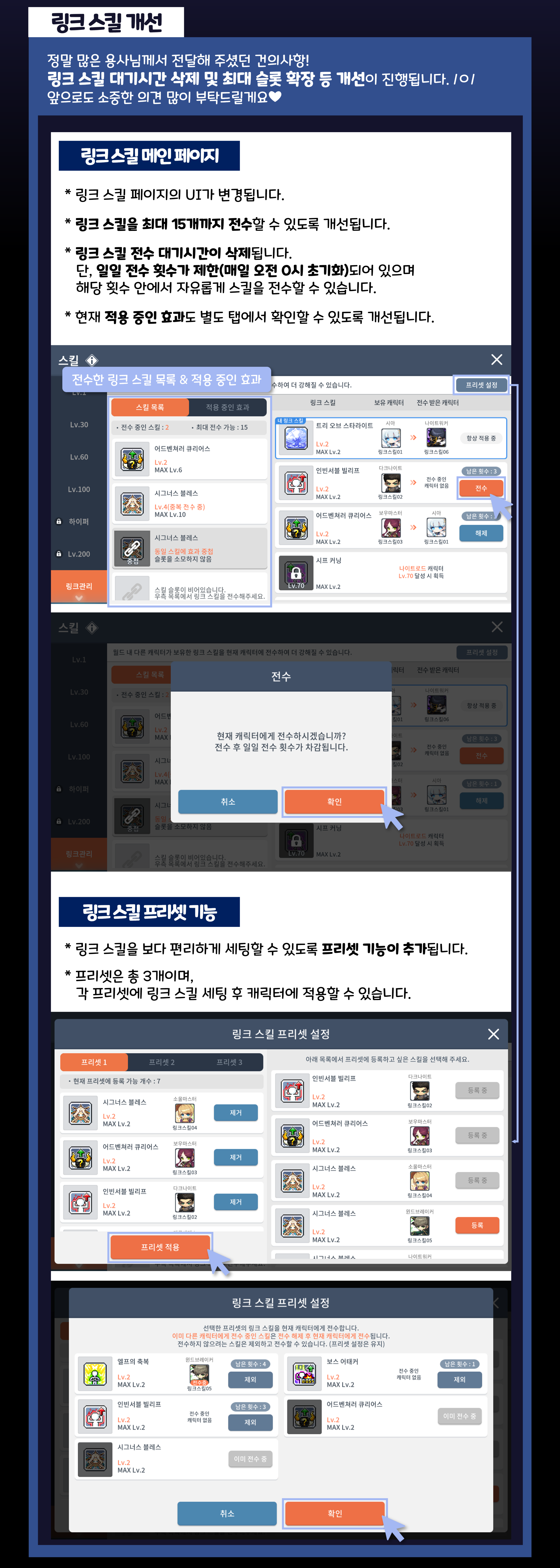 -링크 스킬 개선 (링크스킬 UI 개선 / 링크스킬 재전수 대기시간 제거 / 링크스킬 전수 매일 3회 제한 / 링크스킬 프리셋 기능 추가 / 링크스킬 15칸으로 확장)