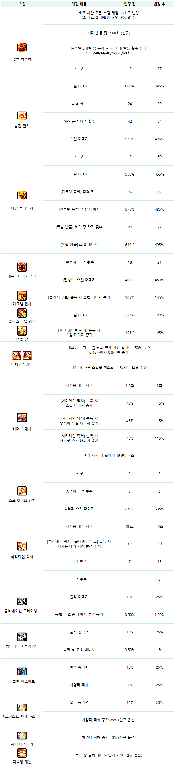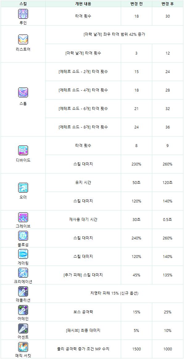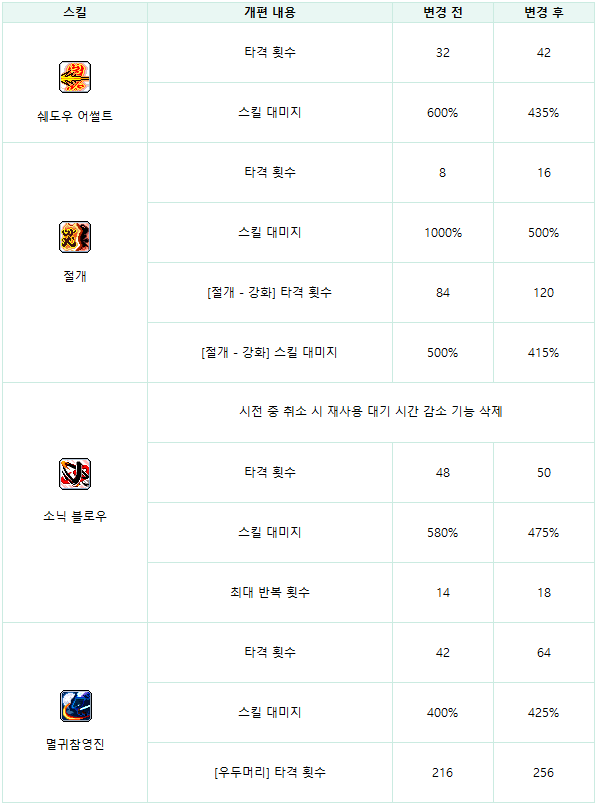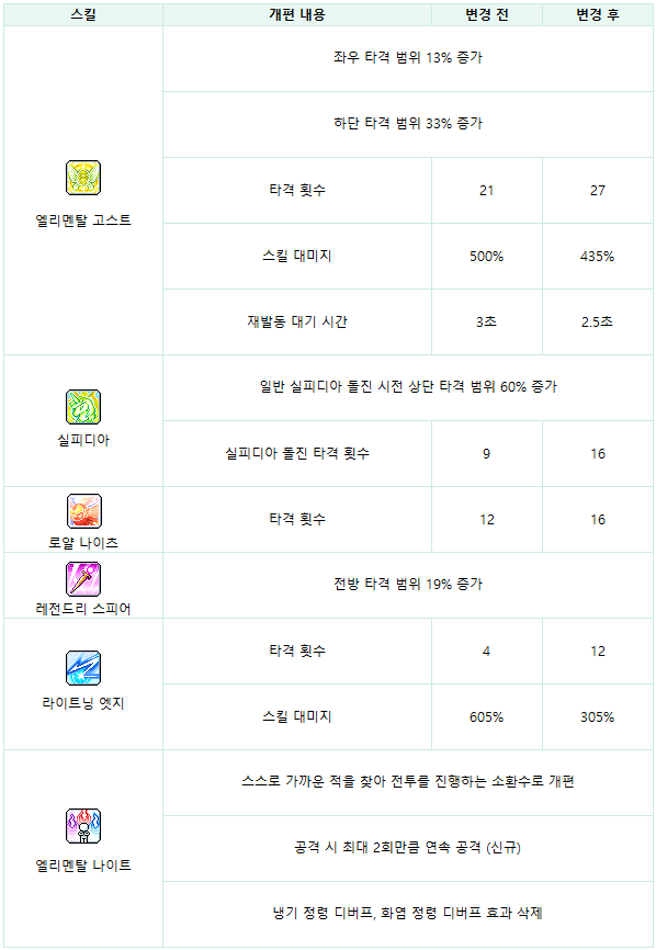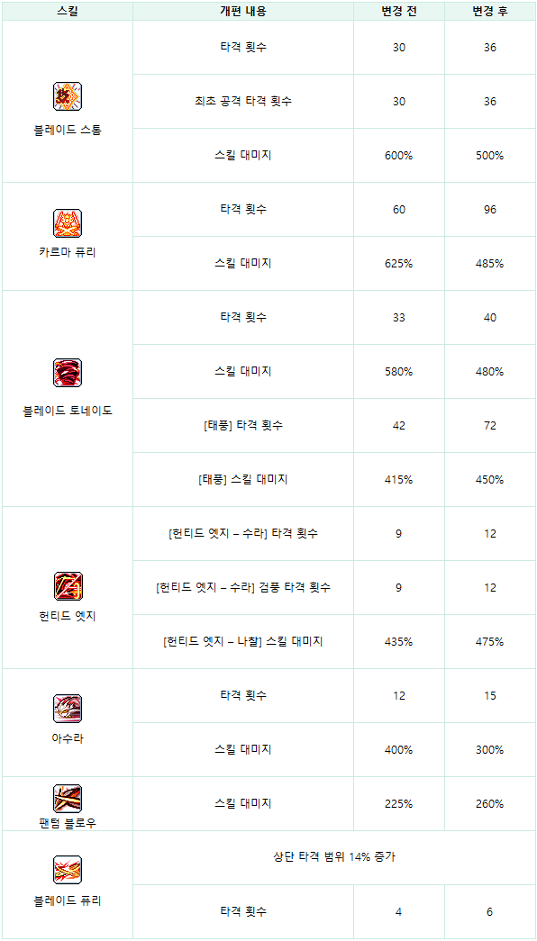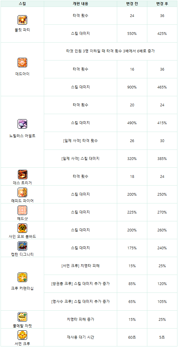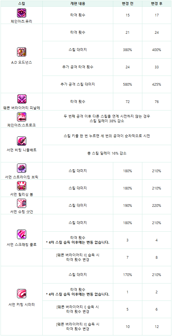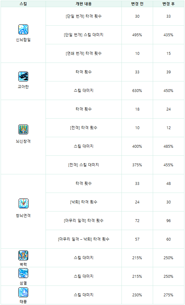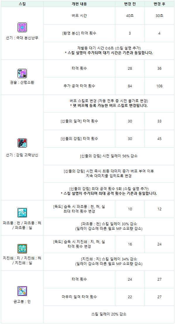 * 모든 스킬 개편 내용은 최대 스킬 레벨 기준으로 작성되었습니다. 추가로 일반적인 상향이 아닌 특정 스킬이 큰 수준으로 변경되었거나 구조적인 변경이 존재하는 경우 해당 직업의 개편 항목 상단에 상세한 설명을 추가했습니다.