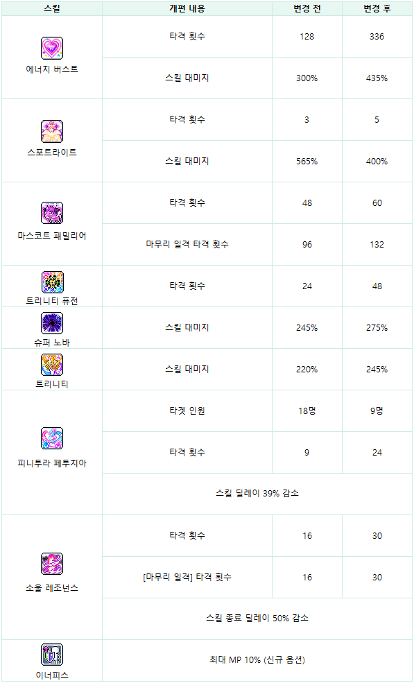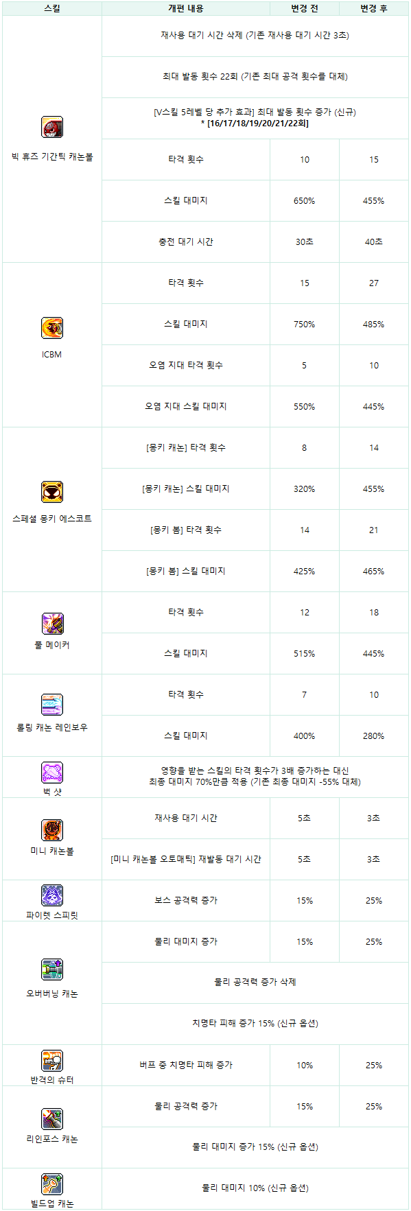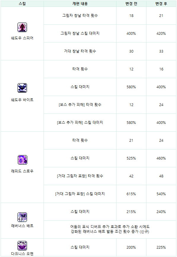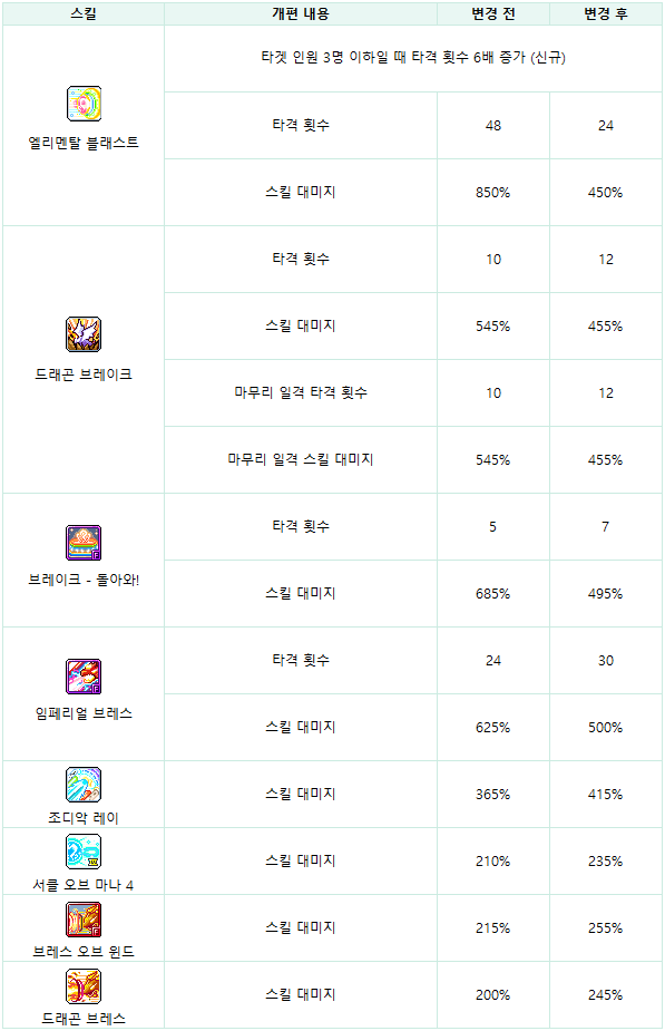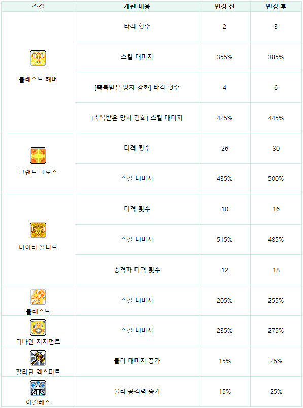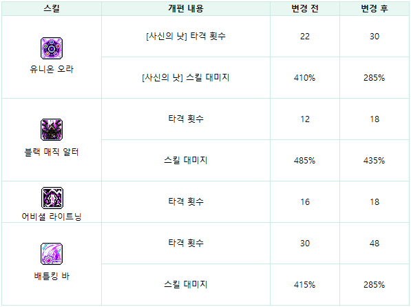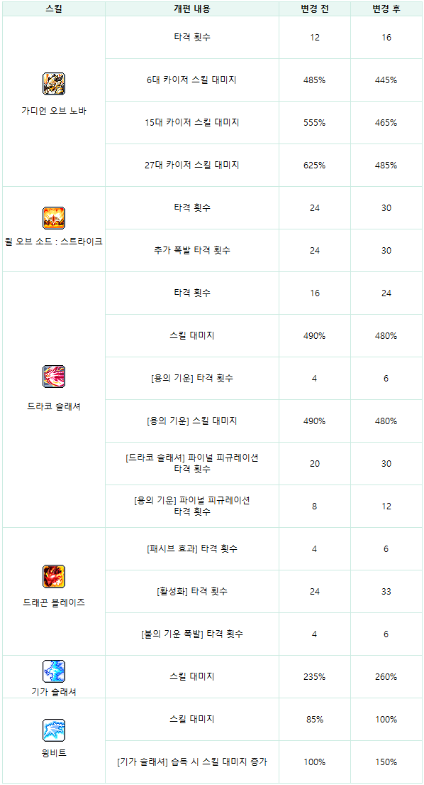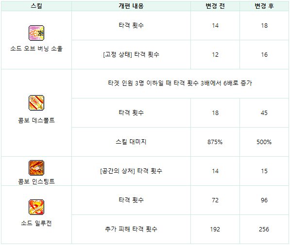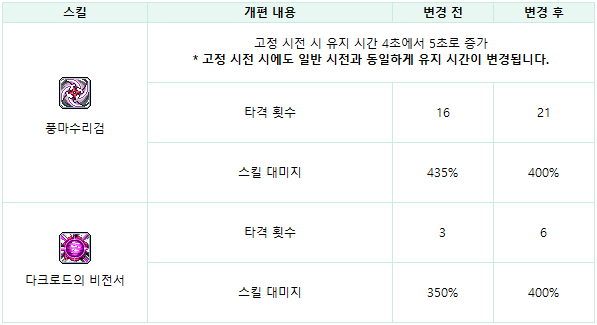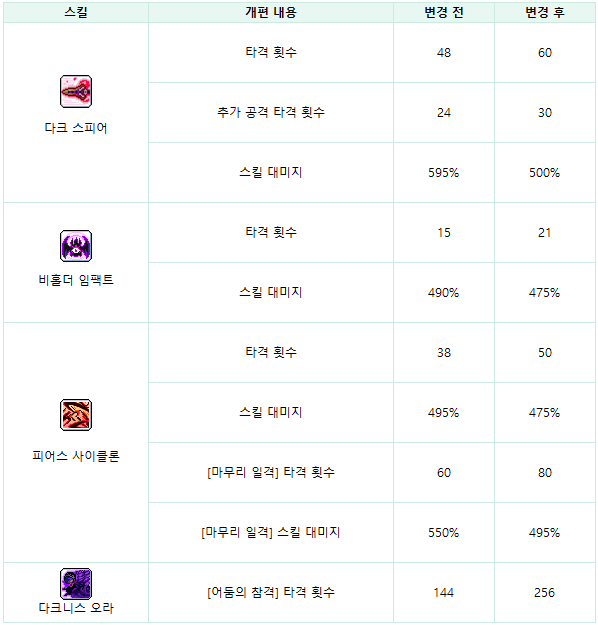 * 모든 스킬 개편 내용은 최대 스킬 레벨 기준으로 작성되었습니다. 추가로 일반적인 상향이 아닌 특정 스킬이 큰 수준으로 변경되었거나 구조적인 변경이 존재하는 경우 해당 직업의 개편 항목 상단에 상세한 설명을 추가했습니다.