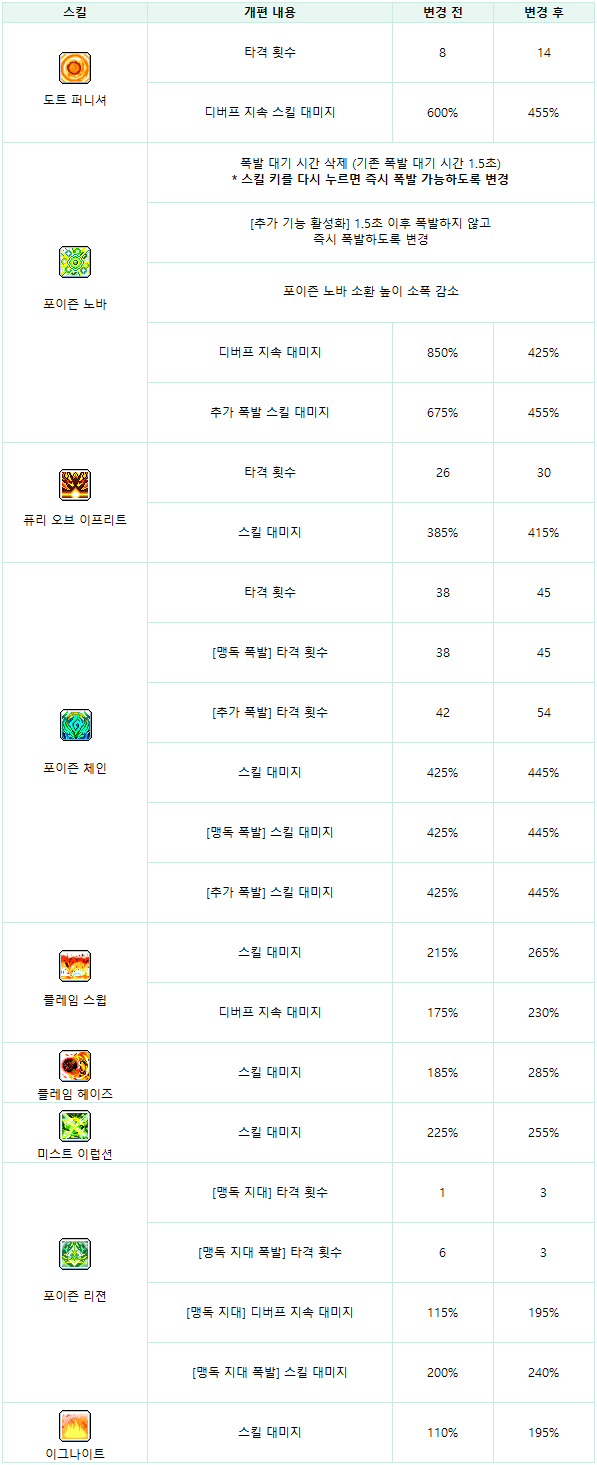 포이즌 리젼도 포이즌 노바와 유사한 이유로 보스 대상 크기가 클수록 더 많은 맹독 지대 폭발에 영향을 받고 있어 이를 일정 부분 해결하기 위해 맹독 지대, 맹독 지대 폭발의 점유율을 조정하여 보스 크기에 따른 편차가 소폭 완화되도록 조정했습니다.