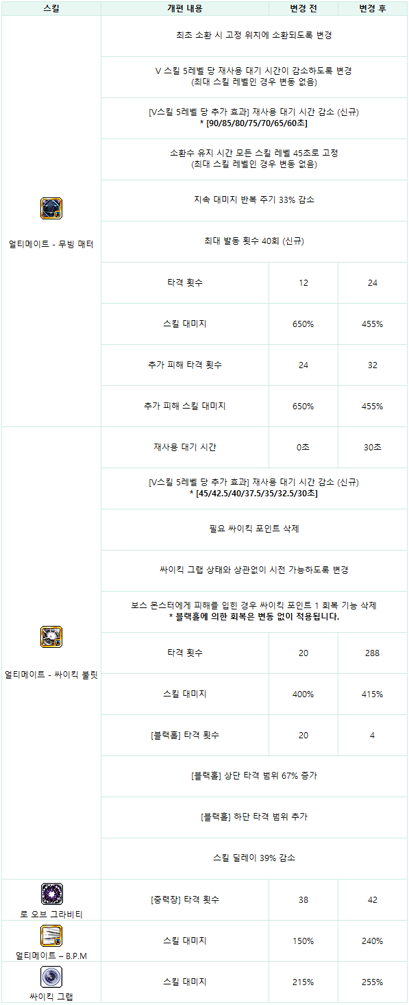 얼티메이트 – 싸이킥 불릿의 스킬 사용 조건을 삭제하고 피해량을 대폭 상향 조정하여 보스 전투에서 활용될 수 있도록 개편했습니다.