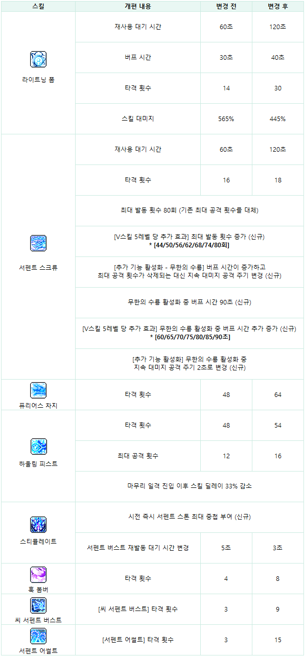 서펜트 스크류 또한 라이트닝 폼이 가지고 있었던 시전 시점 컨트롤에 의한 편차가 존재하여 스킬 사용 주기를 2분으로 변경하고 가동률을 조정하는 대신, 기존 존재했던 최대 공격 횟수 제한을 최대 발동 횟수 제한으로 변경하고 타격 횟수를 상향 조정하여 이전보다 더 높은 DPS를 기록할 수 있도록 조정했습니다.