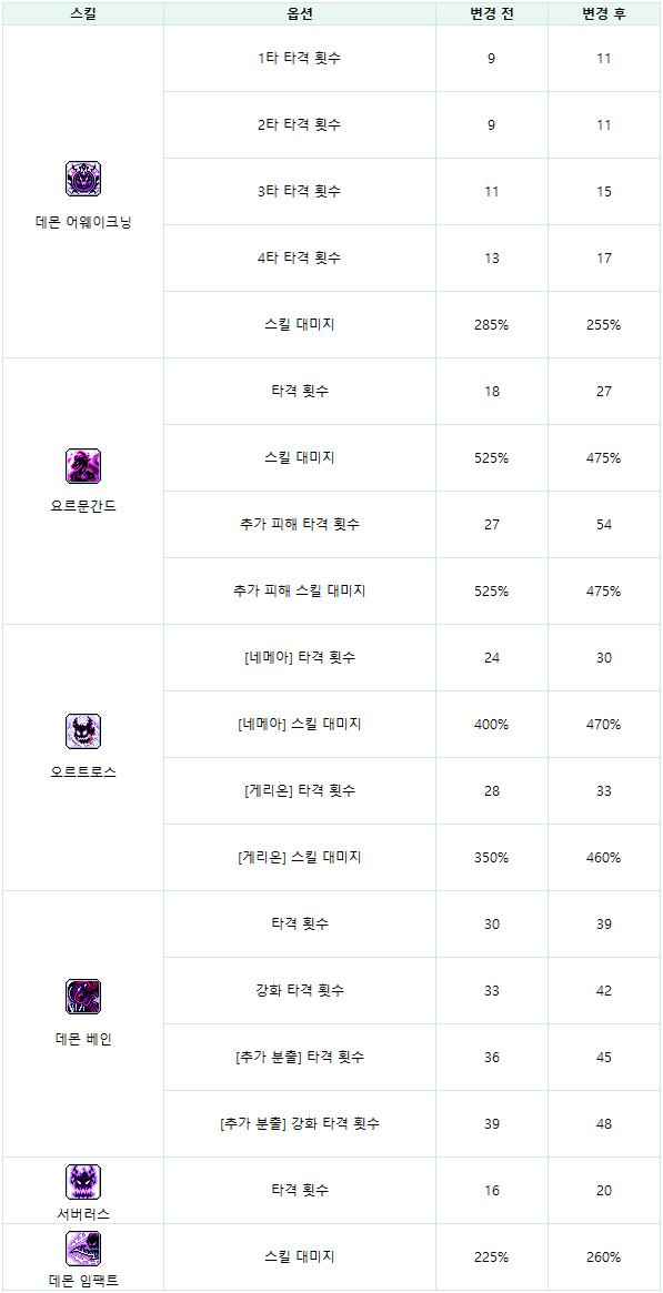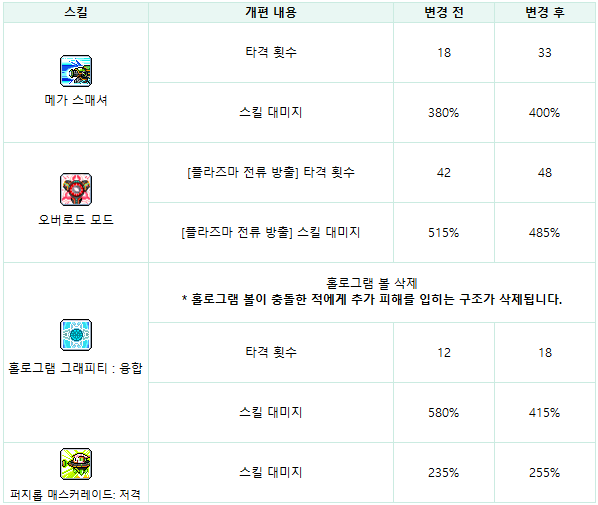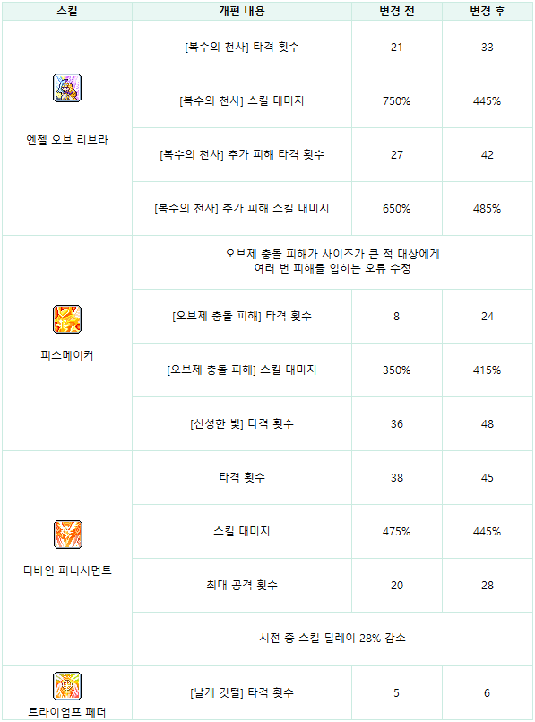 단, 이번 개편으로 점유율이 급격히 높아지는 부분에 대한 조정을 위해 스킬 대미지 조정을 같이 진행했습니다.