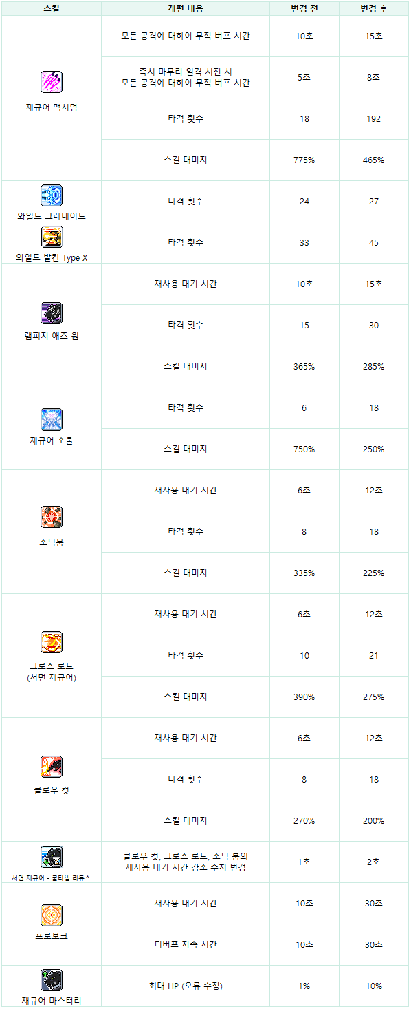 재규어 맥시멈의 스킬 효율을 대폭 상향 조정하고 모든 공격에 대하여 무적 시간을 추가로 상향하여 DPS 주력 스킬로 활용됨과 동시에 기존 무적 유틸 스킬의 효율도 상향 조정되도록 개편했습니다.