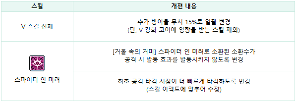 기존 스파이더 인 미러는 일반형 소환수로 공격 시 발동 효과를 지속적으로 발동시켜 특정 직업이 가진 스킬의 발동 효과를 더 높은 효율만큼 추가로 발동시켜 직업 간 형평성이 맞지 않는 문제를 가지고 있어 이번 개편에서 공격 시 발동 효과를 발동시키지 않도록 조정을 진행했습니다.