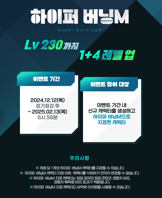 -이벤트 참여대상 : 이벤트 기간내 '신규 캐릭터를 생성하고' 하이퍼 버닝M으로 지정한 캐릭터