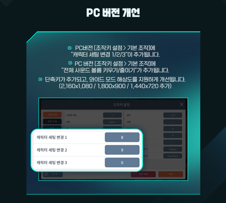 -PC버전 개선 (캐릭터 세팅 변경 / 전체 사운드 볼륨 / 와이드 모드 해상도 지원)