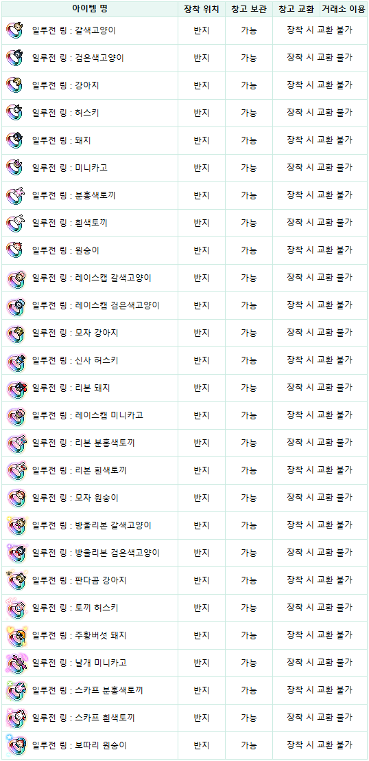 - 슈피겔만의 마법모자에서 획득 가능한 일루전 링 리스트는 아래와 같습니다.