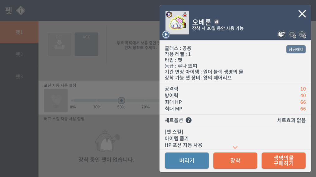 - 장착 중인 펫의 펫 장비 버튼을 터치하여 장착 해제가 가능하도록 개선했습니다.