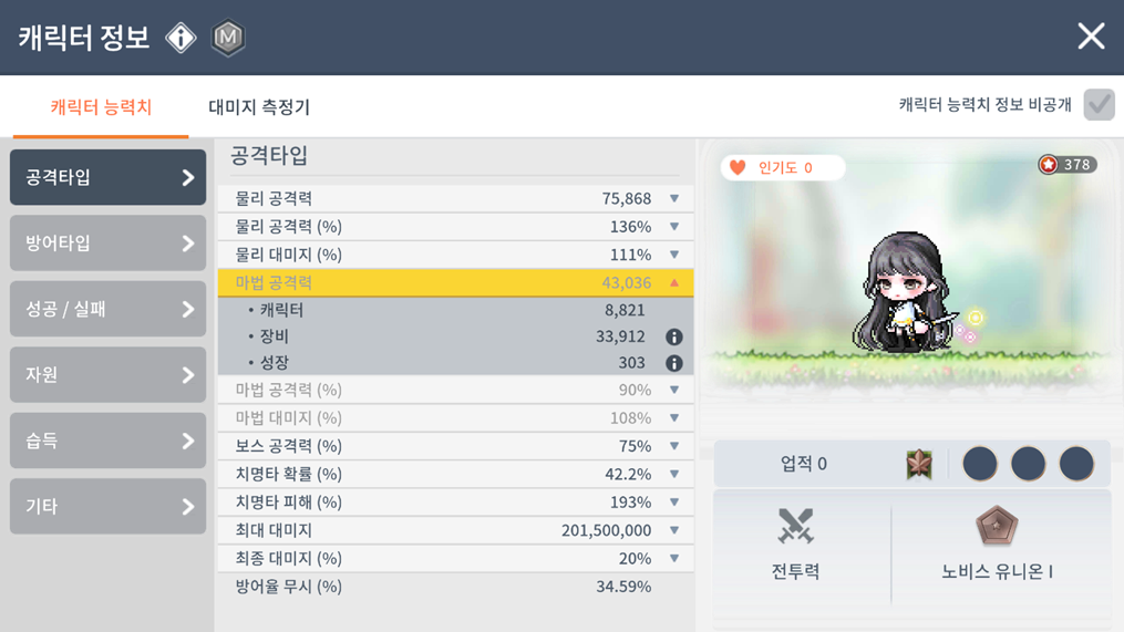- 캐릭터 능력치 창에서 능력치별 획득처를 확인할 수 있습니다.