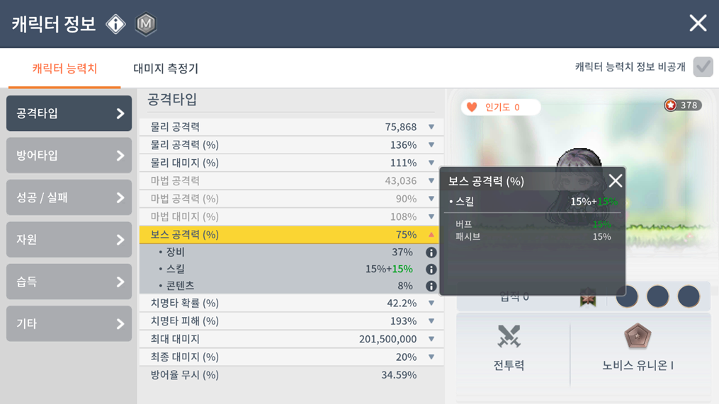캐릭터가 보유하고 있는 능력치의 세부정보를 확인할 수 있도록 캐릭터 정보창의 캐릭터 능력치 표기가 개선됩니다.