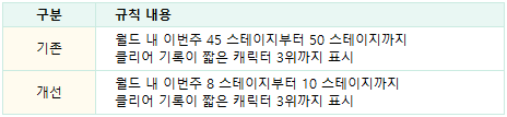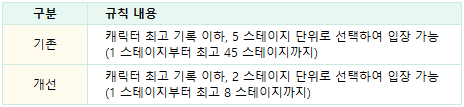 - 클리어한 스테이지가 있다면 중간부터 입장할 수 있는 규칙이 다음과 같이 변경됩니다.
