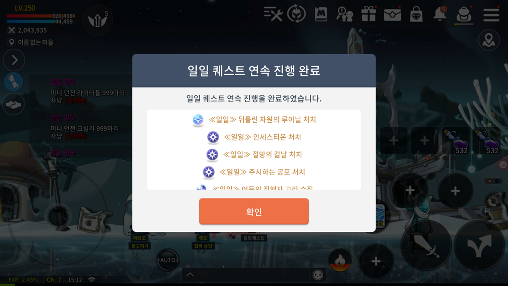 - 선택한 일일 퀘스트를 모두 완료하면, 위치한 지역의 마을로 순간이동하며 완료 팝업이 표시됩니다.
