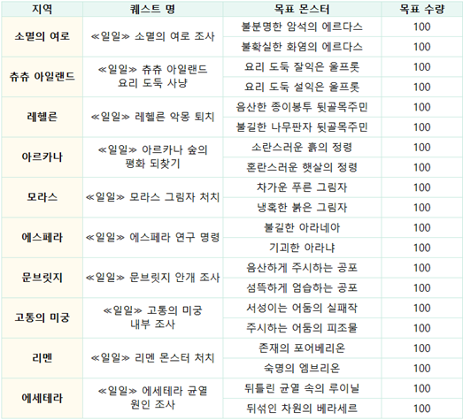 - 아케인 리버 지역, 에세테라 지역 퀘스트 중 일일 퀘스트 대사가 일부 수정됩니다.