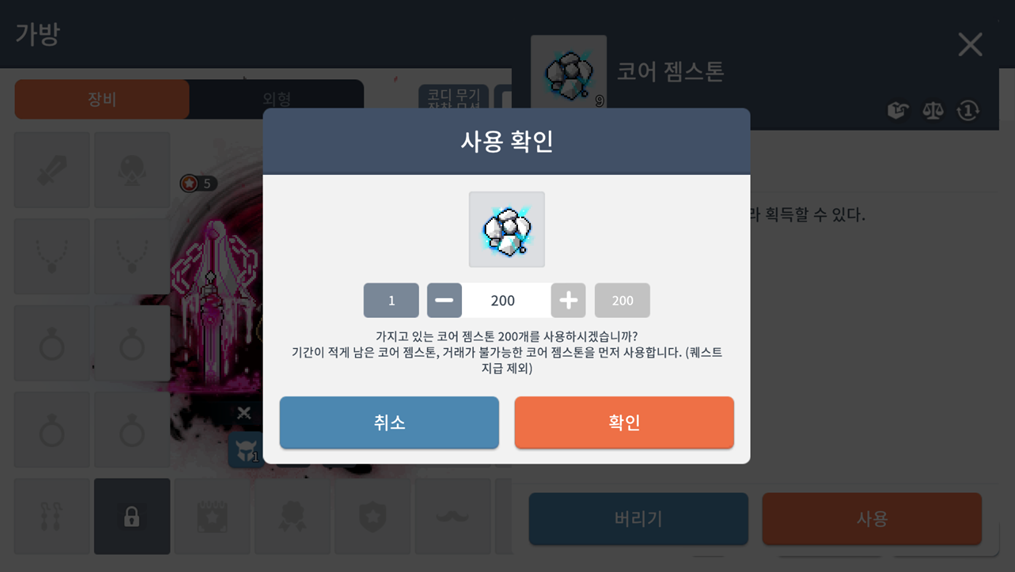 - 가방의 포션 아이템과 코어 젬스톤 아이템을 99개를 초과한 복수로 보유 중인 상태에서,