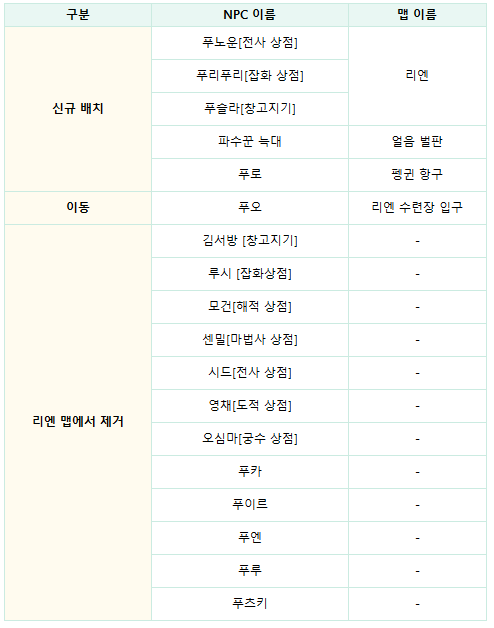 - 리엔에 배치된 NPC가 신규 배치 또는 이동, 제거됩니다.