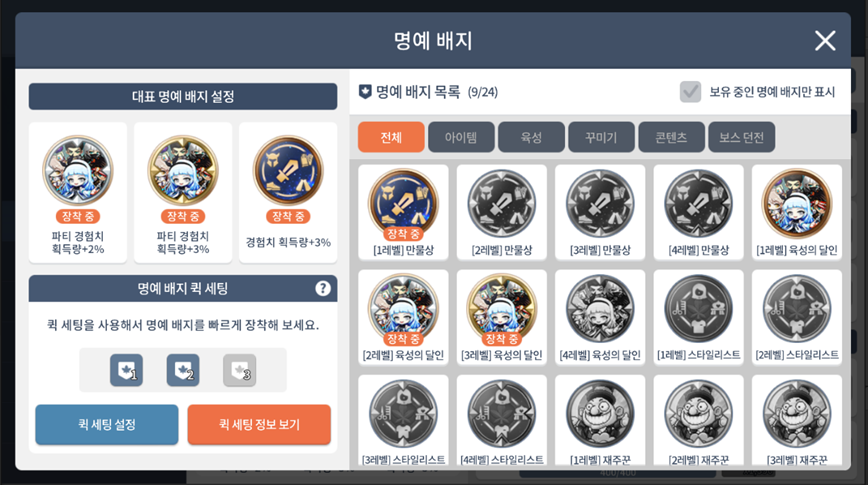 - 캐릭터 정보창에 표시되는 명예 배지 영역의 터치가 잘 되지 않는 현상 수정