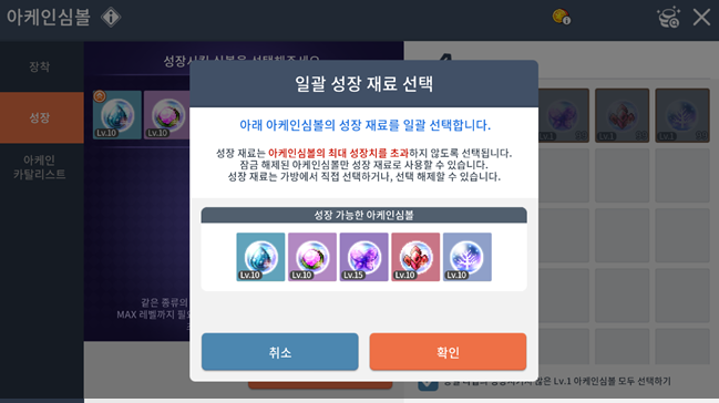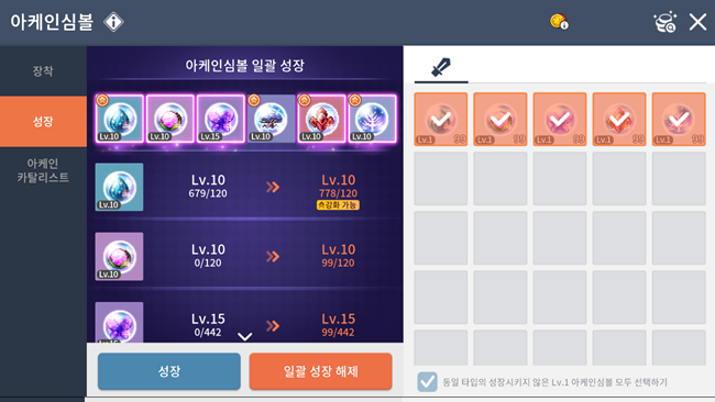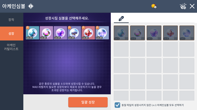 - [아케인심볼]-[성장] 탭 하단에 [일괄 성장] 버튼이 추가됩니다.
