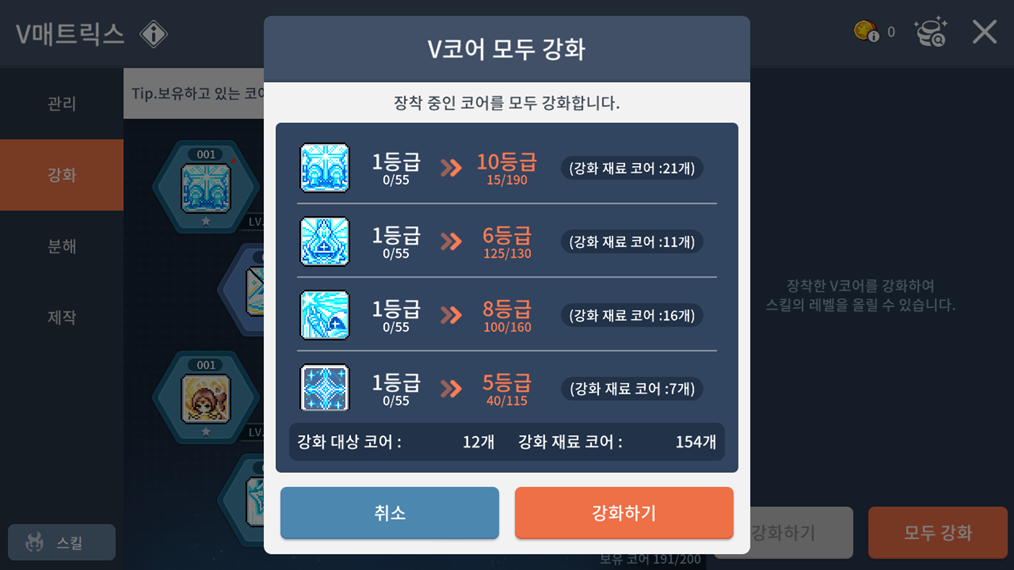 - [모두 강화]를 통해 현재 캐릭터가 장착 중인 V코어를 한 번에 강화할 수 있습니다.