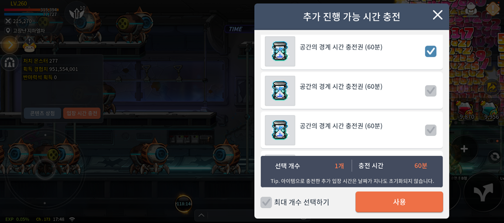 270레벨 이후 경험치는 누적되지만 최고레벨이 확장될 때까지 레벨업은 하지 않습니다.