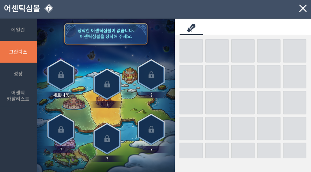 - [성장] 탭에서는 장착 중인 각 지역의 어센틱심볼을 모두 확인할 수 있습니다.