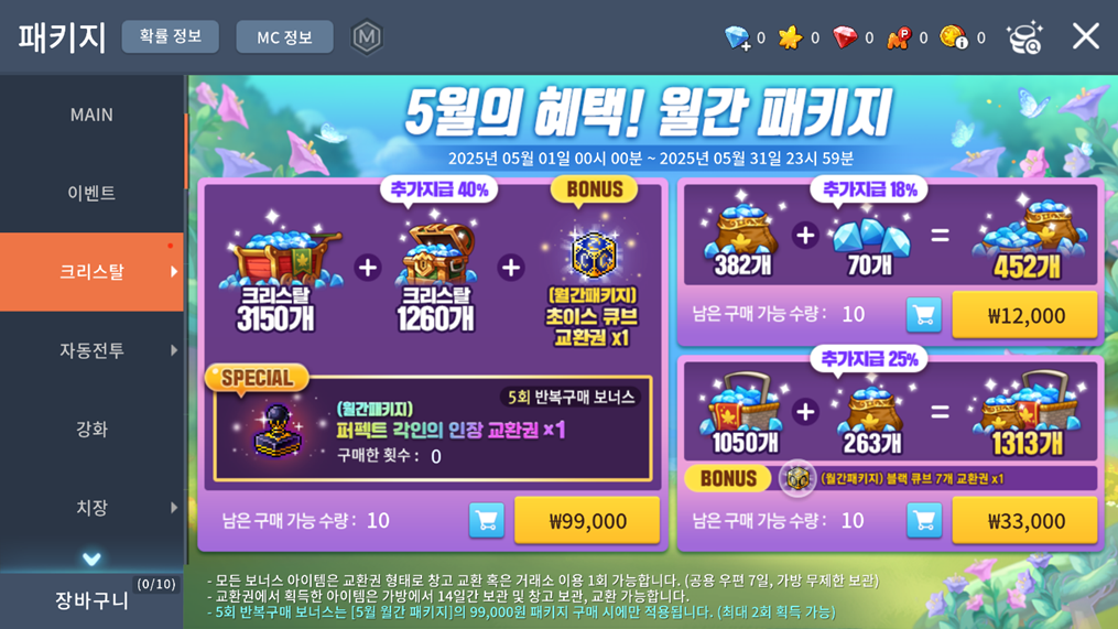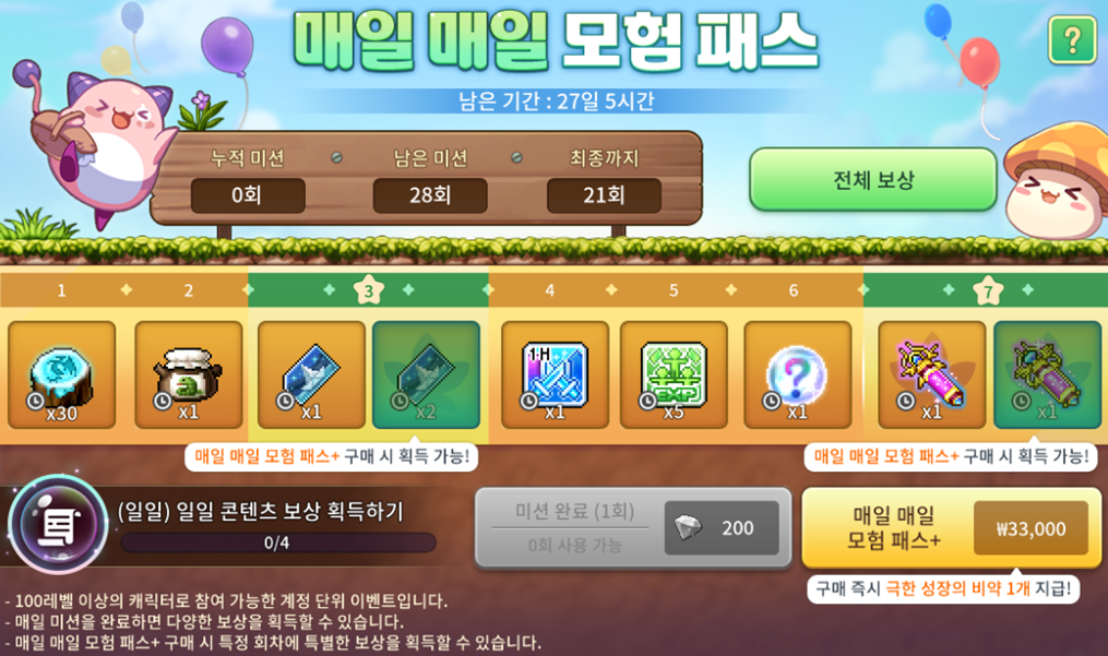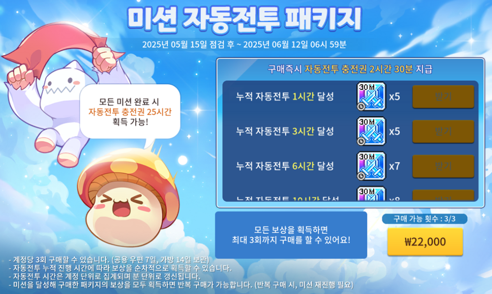 - 미션을 달성해 구매한 패키지의 보상을 모두 획득하면 반복 구매가 가능합니다. (반복 구매 시, 미션 재진행 필요)