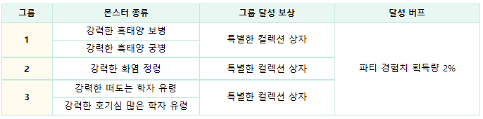 - 보스 클리어 시 기여도 미달로 보상을 획득하지 못한 경우 몬스터 컬렉션도 획득할 수 없도록 변경됩니다.