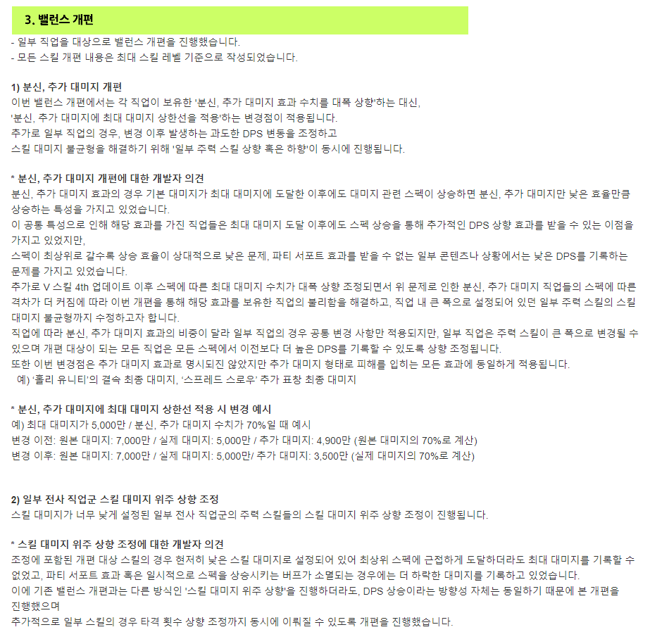 대부분의 스킬은 상향 조정되지만 일부 너무 높은 효율을 가지고 있었던 스킬, 일부 파티 서포트 역할의 스킬에 한하여 단편적으로 조정될 수 있습니다. 단, 해당 직업의 다른 스킬들을 이를 상회하는 수준으로 추가 상향하여 모든 직업이 이전보다 더 높은 DPS를 기록할 수 있도록 조정했습니다.